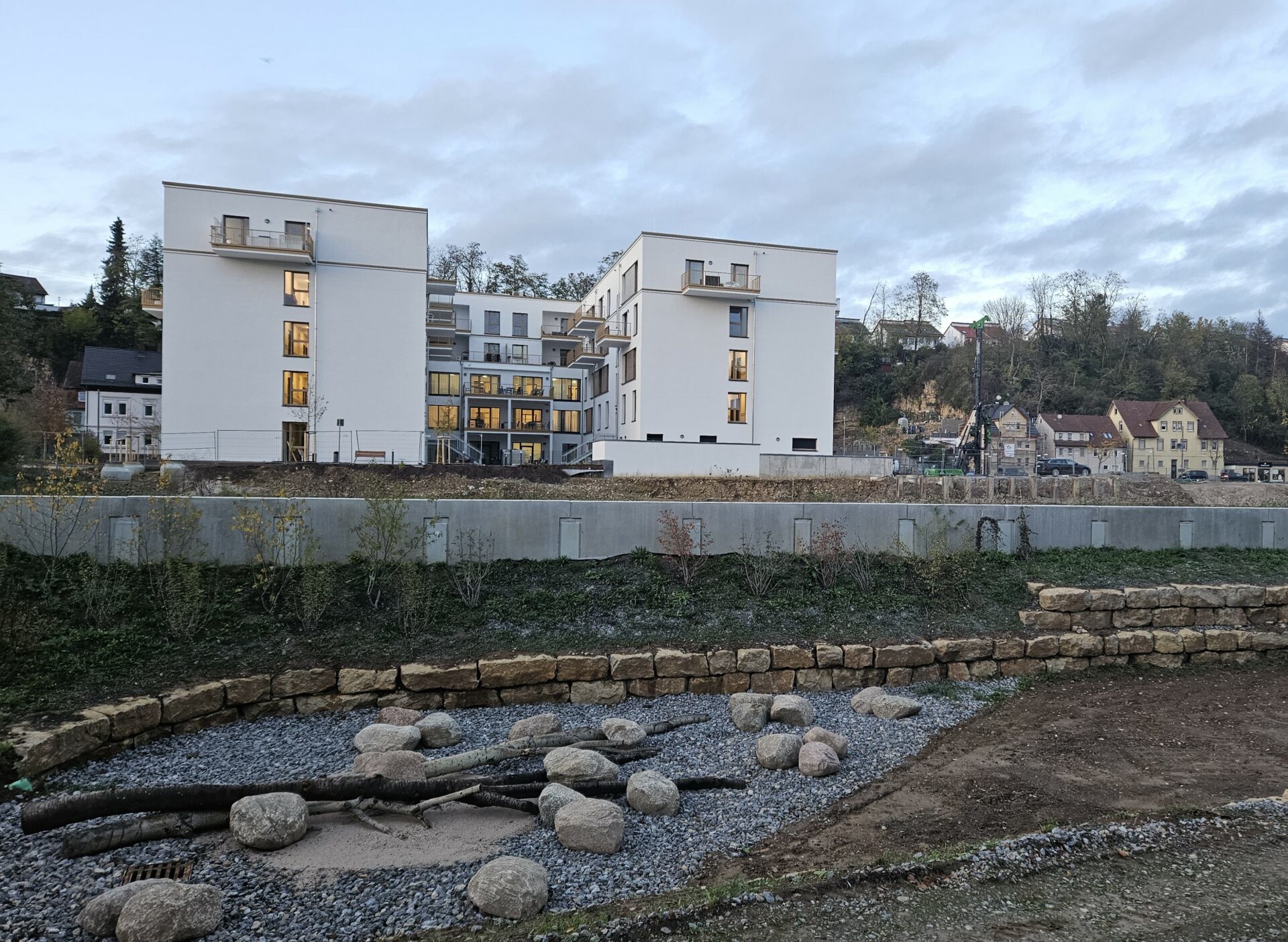 Der erste Bauabschnitt im Stadtquartier Obere Walke in Backnang ist damit abgeschlossen. Auch die Herstellung des notwendigen Retentionsraums (Hochwasserschutz) entlang des Plangebiets ist nahezu fertiggestellt. Da die Baugenehmigungen für die folgenden Bauabschnitte bereits vorliegen, kann sich die DIBAG nun auf die Umsetzung des 2. Bauabschnitts mit knapp 100 Wohnungen sowie einem Ärzte- und Bürohaus konzentrieren.