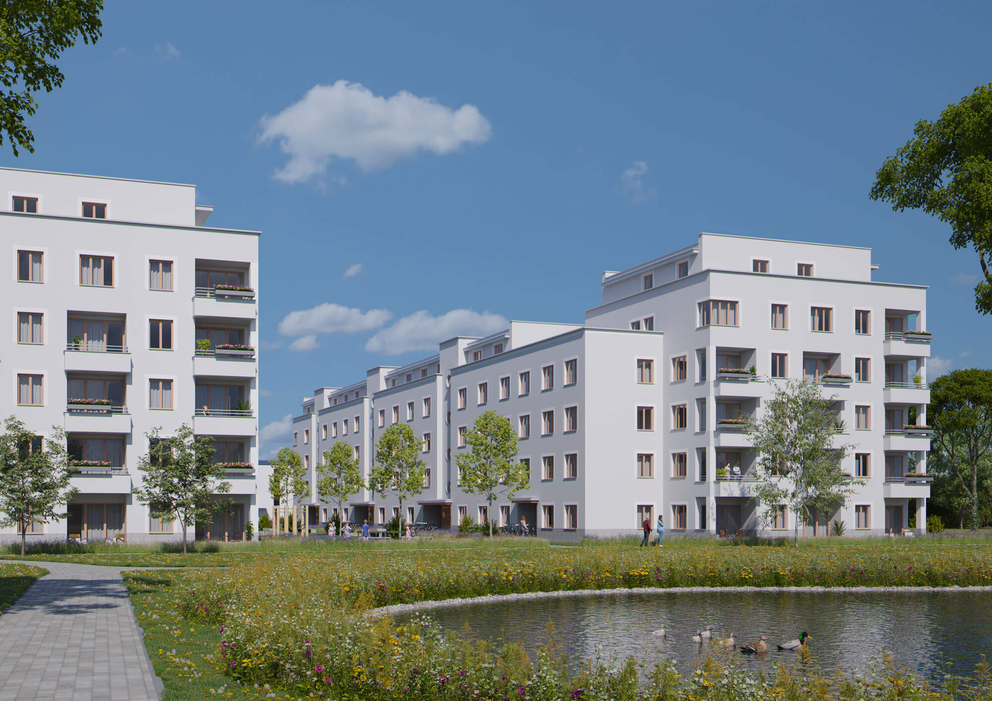 Im Westen der Stadt entsteht ein naturnahes Stadtquartier mit 14 Mehrfamilienhäusern und einem Kitagebäude auf einer Geschossfläche von 25.300 m². Mehr als 90% der 285 Wohneinheiten werden barrierefrei gestaltet.