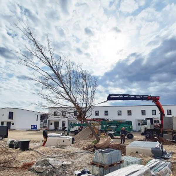Schützenswerte Bäume erhalten: Vier Bäume haben in der „Grünen Mitte“ des Rathausviertels, des gerade fertiggestellten Wohnquartiers in Kirchheim, eine neue Heimat gefunden. Sie standen vorher an der Dülferstraße, wo gerade durch ein Nachverdichtungsvorhabens dringend benötigter Wohnraum in der Stadt geschaffen wird.