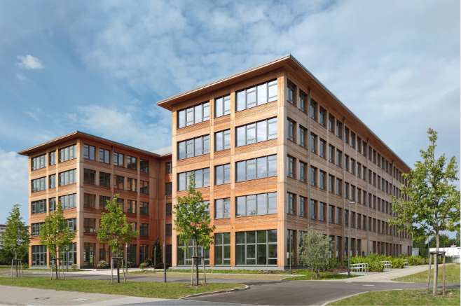 Das als Holzbau konzipierte, fünfstöckige Bürohaus ist ein Musterbeispiel für den Einsatz ökologischer Materialien und in dieser Größenordnung und Geschossigkeit eine Besonderheit.
