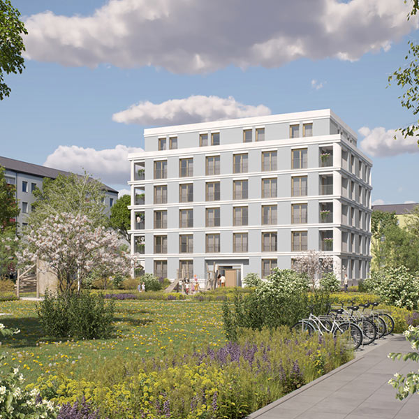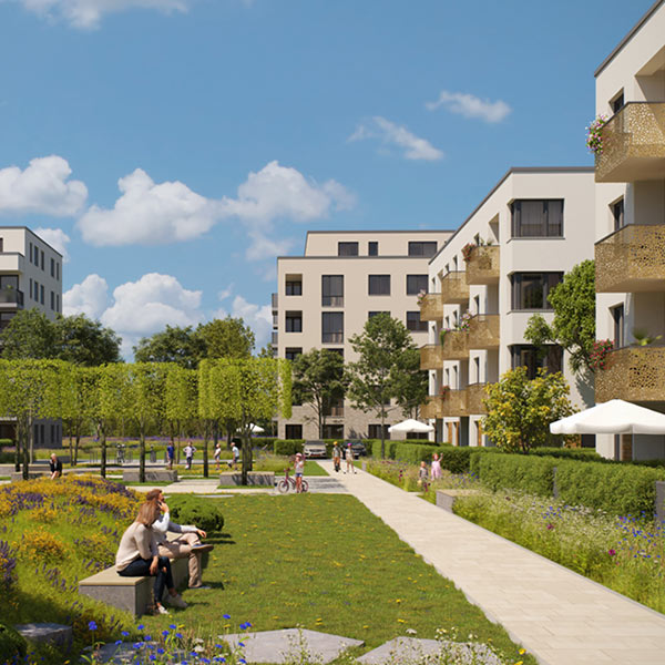 Ein Schwerpunkt der DIBAG liegt auf der Entwicklung ganzheitlicher Wohn- und Stadtquartiere. Klimaschutz und nachhaltige Energieversorgung, clevere Flächenplanung, Nutzungsmischung, resiliente Verkehrskonzeption, Durchlüftung und Luftqualität sowie Themen rund um die Biodiversität sind laut DGNB die entscheidenden Handlungsfelder der Quartiersentwicklung. Besonderen Wert legen wir deshalb auf die Durchmischung von Wohnen mit passenden Gewerbeeinheiten und sozialen Einrichtungen. Große Quartiersplätze mit Kinderspielplätzen, Grünanlagen und Coworking-Spaces formen öffentliche Begegnungsflächen. Die nachhaltige Gestaltung ganzer Quartiere leistet einen Beitrag zur Verbesserung des (Mikro-)Klimas und trägt gerade in Zeiten des Wohnraummangels dazu bei, der zunehmenden Urbanisierung Rechnung zu tragen.