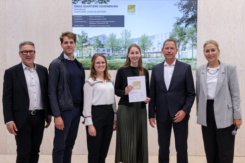 Im Rahmen der Expo Real in München vom 4. bis 6. Oktober 2023 wurde der DIBAG Industriebau AG für das geplante Stadtquartier in Hohenbrunn das Vorzertifikat DGNB Gold verliehen.